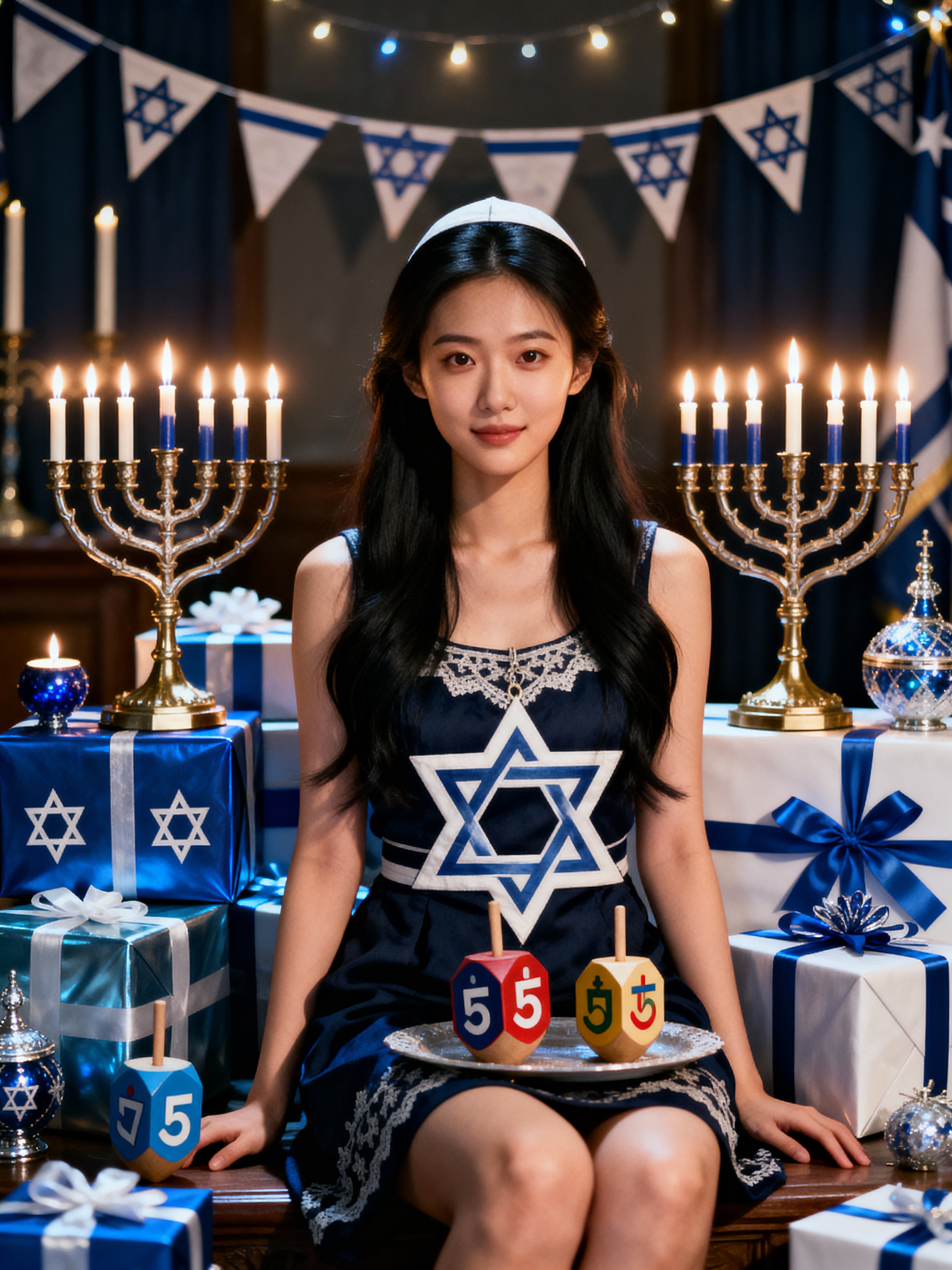 a stunning model surrounded by beautiful Hanukkah decorations and gifts , capturing the sense of miracle and family connection during the Festival of Lights