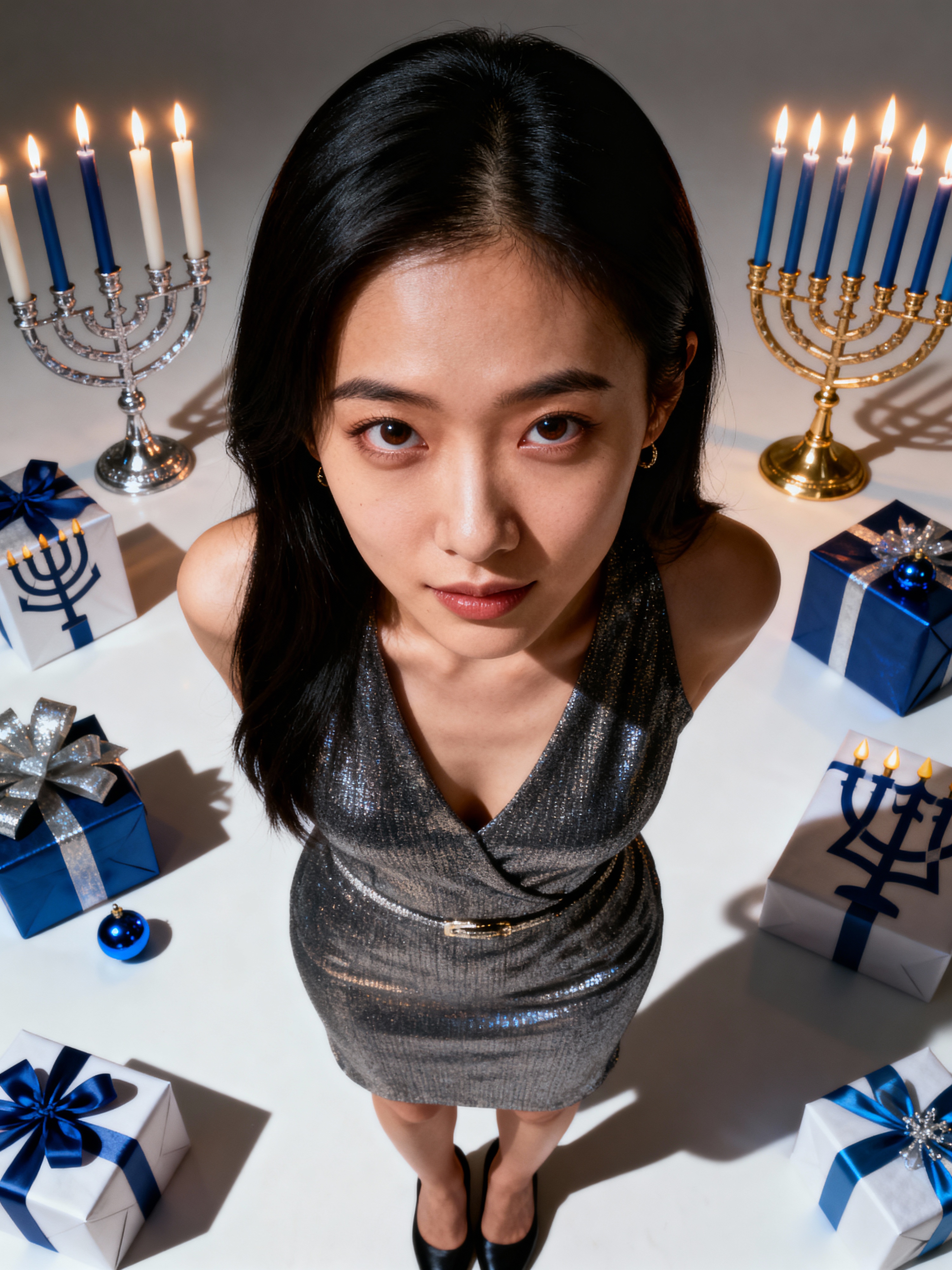 a stunning model surrounded by beautiful Hanukkah decorations and gifts , capturing the sense of miracle and family connection during the Festival of Lights