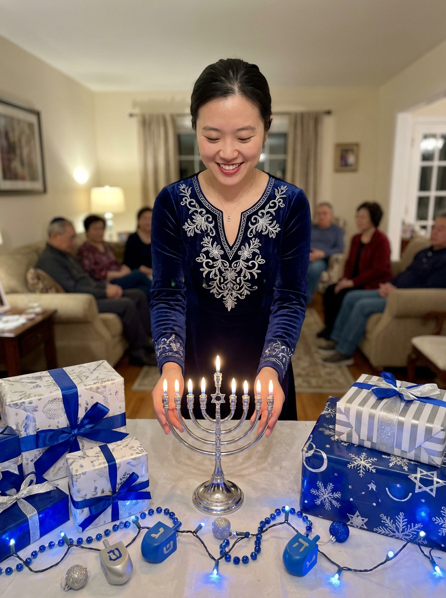 a stunning model surrounded by beautiful Hanukkah decorations and gifts , capturing the sense of miracle and family connection during the Festival of Lights