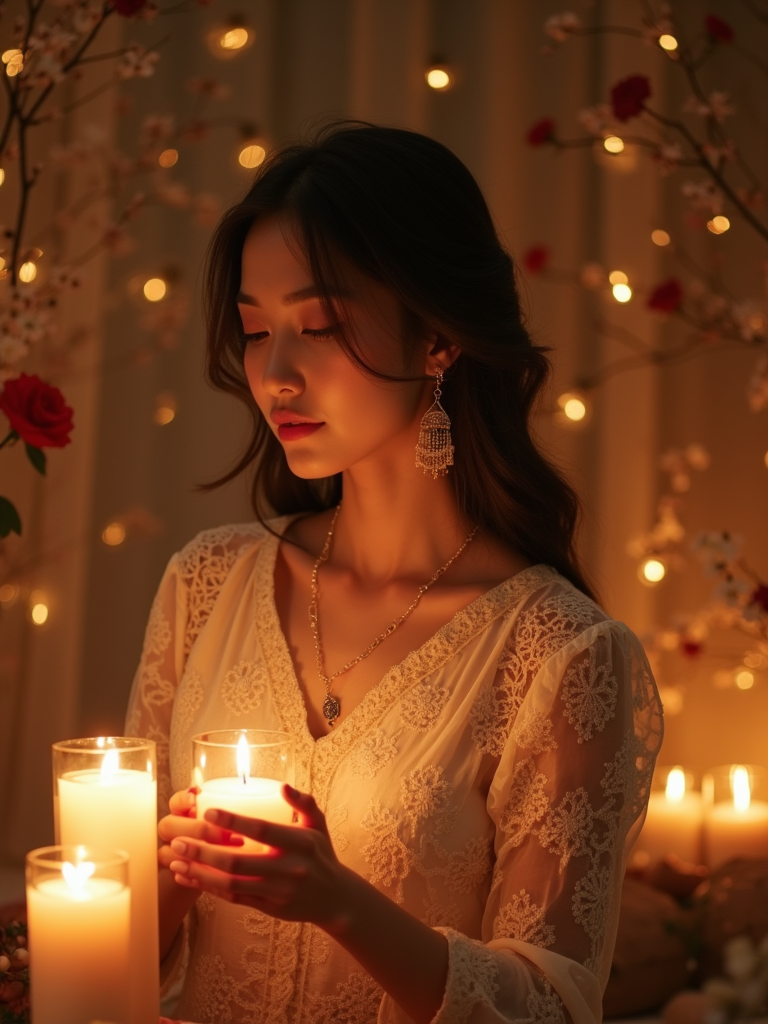 a stunning model surrounded by beautiful Ramadan decorations and candles , capturing the sense of peace and spiritual connection during the holy month