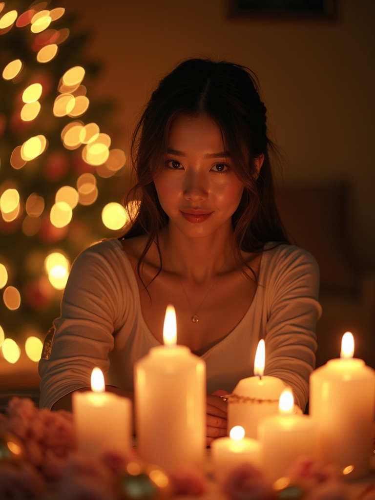 a stunning model surrounded by beautiful Ramadan decorations and candles , capturing the sense of peace and spiritual connection during the holy month