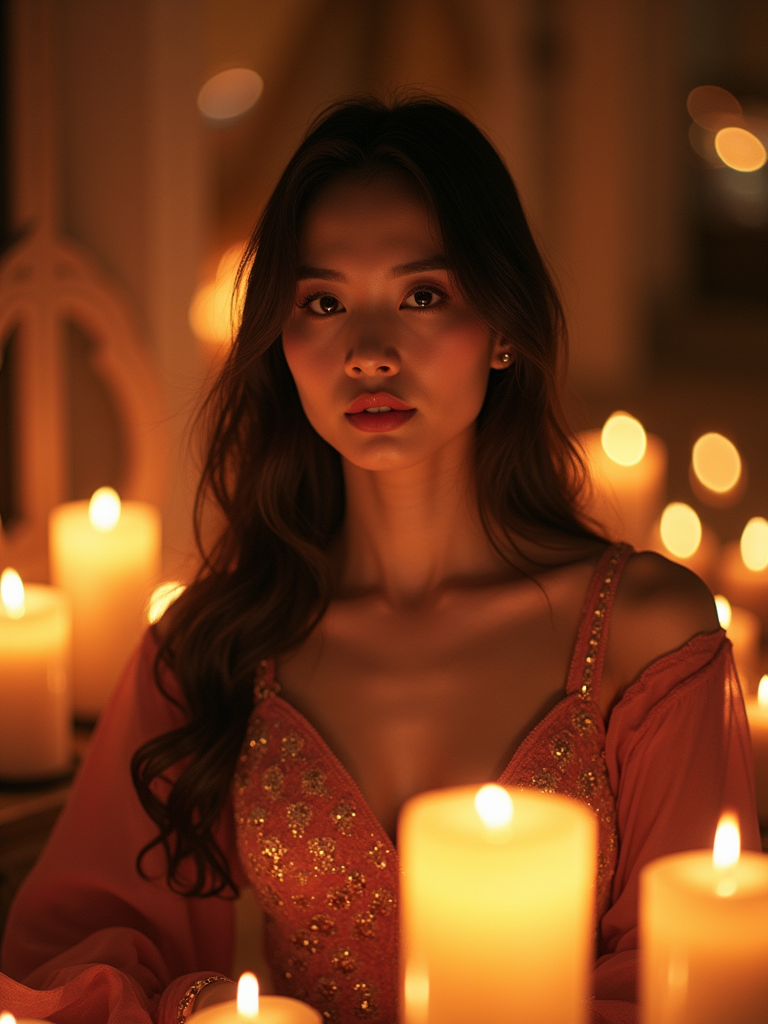 a stunning model surrounded by beautiful Ramadan decorations and candles , capturing the sense of peace and spiritual connection during the holy month