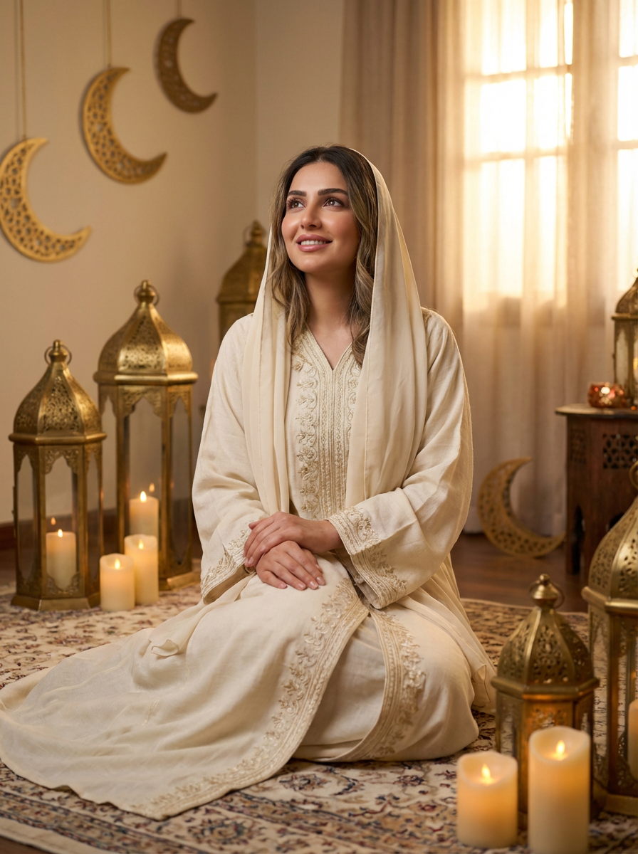 a stunning model surrounded by beautiful Ramadan decorations and candles , capturing the sense of peace and spiritual connection during the holy month
