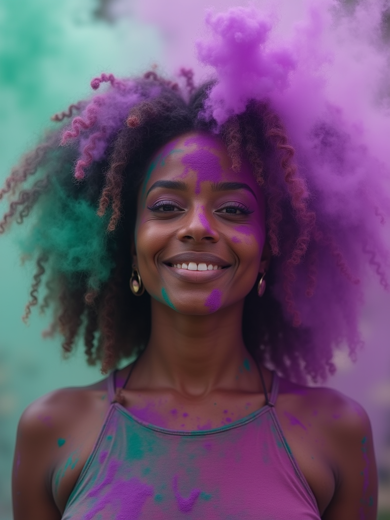 a stunning model surrounded by swirls of purple and green powder in the air , capturing the sense of community and celebration during the festival of colors