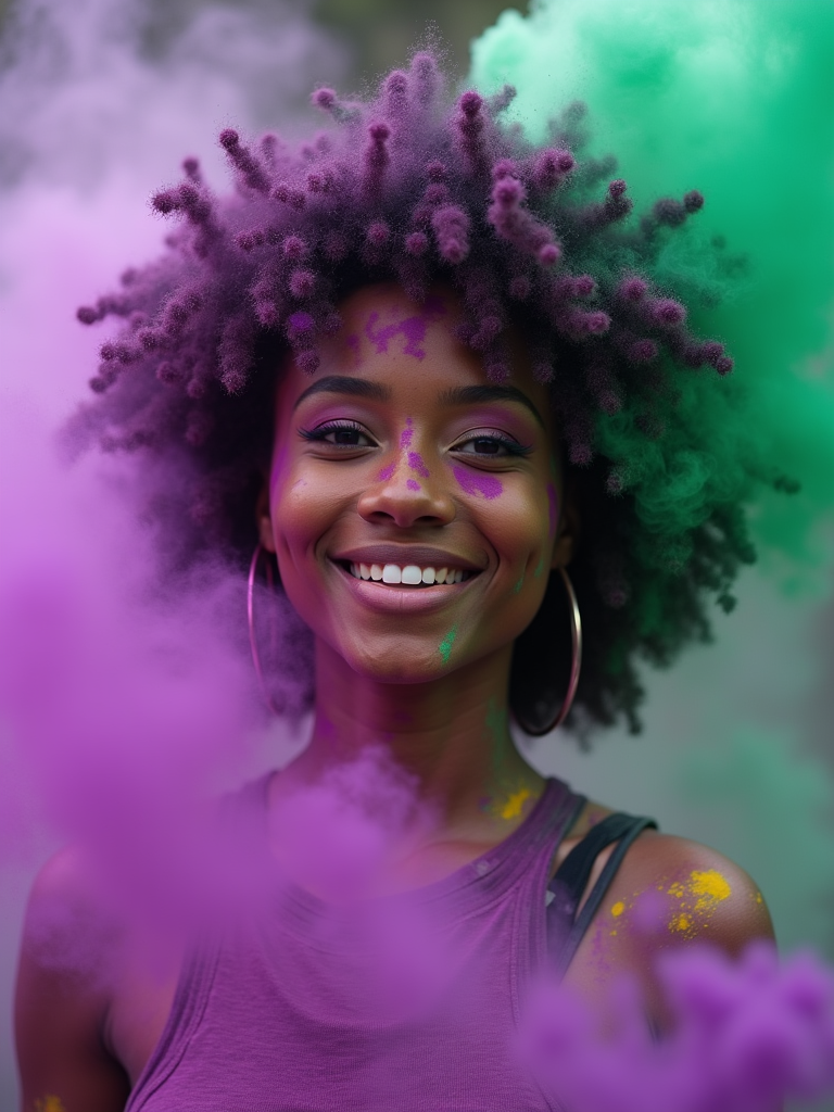 a stunning model surrounded by swirls of purple and green powder in the air , capturing the sense of community and celebration during the festival of colors