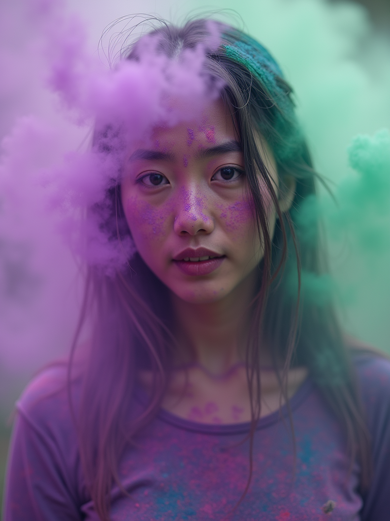 a stunning model surrounded by swirls of purple and green powder in the air , capturing the sense of community and celebration during the festival of colors