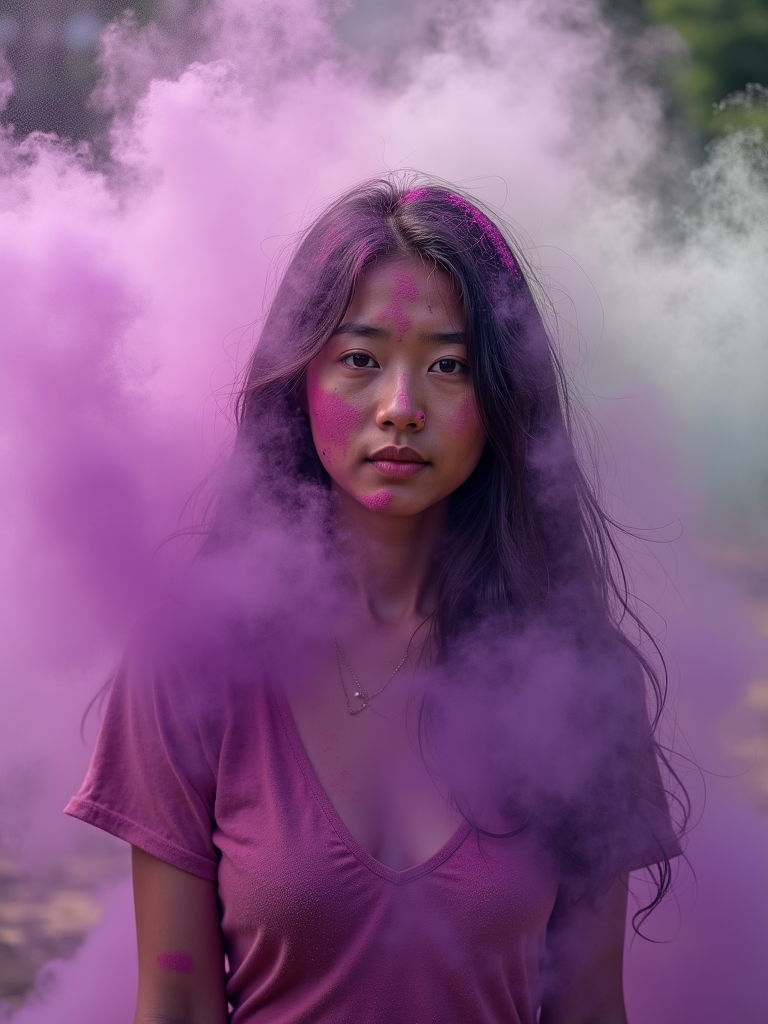 a stunning model surrounded by swirls of purple and green powder in the air , capturing the sense of community and celebration during the festival of colors
