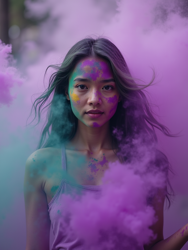 a stunning model surrounded by swirls of purple and green powder in the air , capturing the sense of community and celebration during the festival of colors