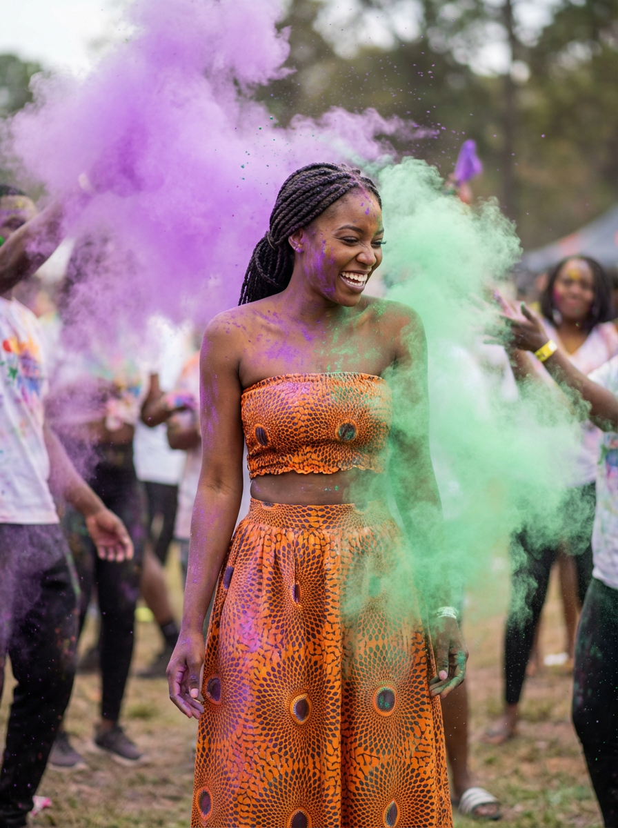 a stunning model surrounded by swirls of purple and green powder in the air , capturing the sense of community and celebration during the festival of colors