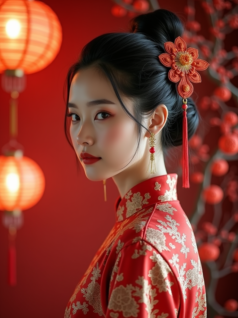 a stunning model with an elegantly styled hair with traditional accessories , capturing the essence of Lunar Chinese New Year traditions in a room decorated with plum blossoms and paper-cut decorations
