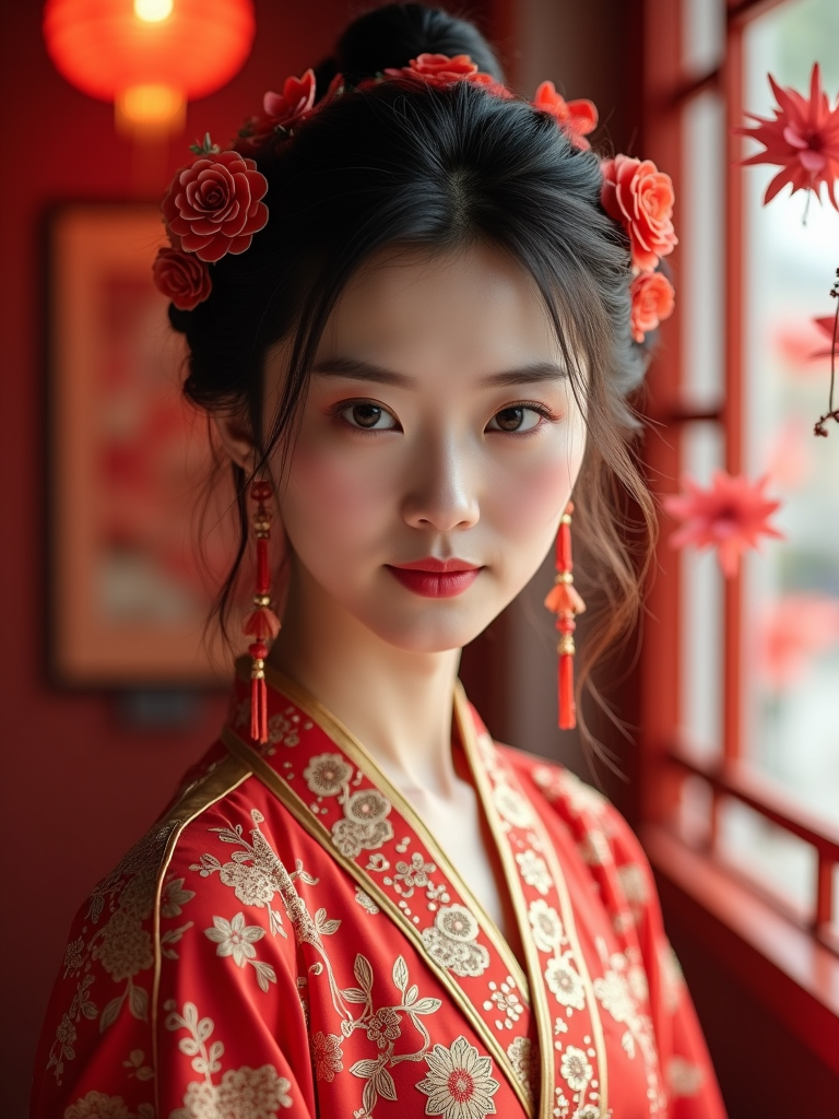 a stunning model with an elegantly styled hair with traditional accessories , capturing the essence of Lunar Chinese New Year traditions in a room decorated with plum blossoms and paper-cut decorations