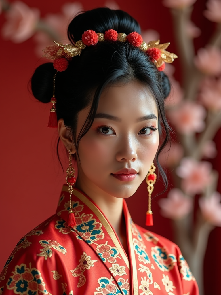 a stunning model with an elegantly styled hair with traditional accessories , capturing the essence of Lunar Chinese New Year traditions in a room decorated with plum blossoms and paper-cut decorations