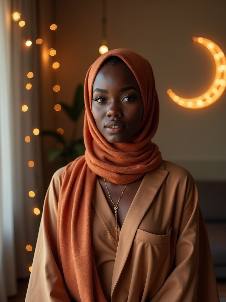 a stunning model with an elegantly styled hijab and modest festive attire , capturing the essence of Ramadan traditions in a room decorated with crescent moons and stars