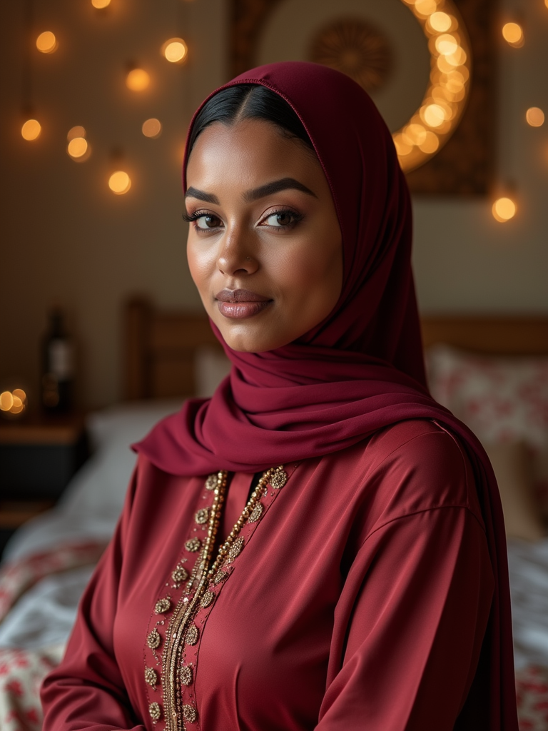 a stunning model with an elegantly styled hijab and modest festive attire , capturing the essence of Ramadan traditions in a room decorated with crescent moons and stars