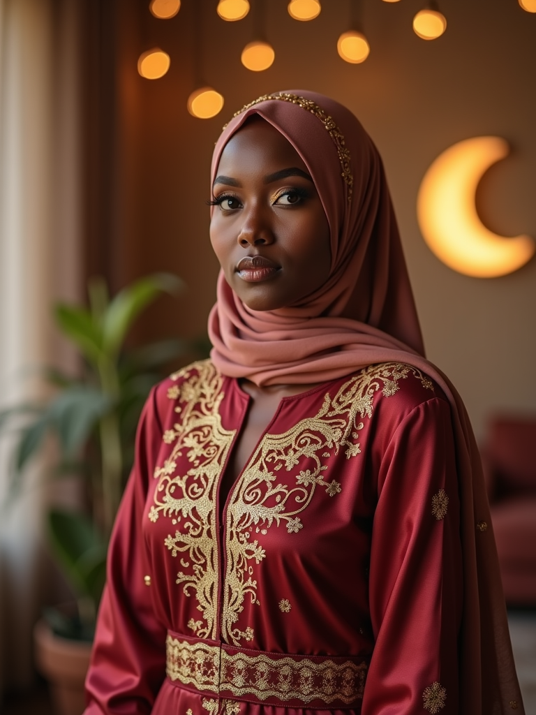 a stunning model with an elegantly styled hijab and modest festive attire , capturing the essence of Ramadan traditions in a room decorated with crescent moons and stars
