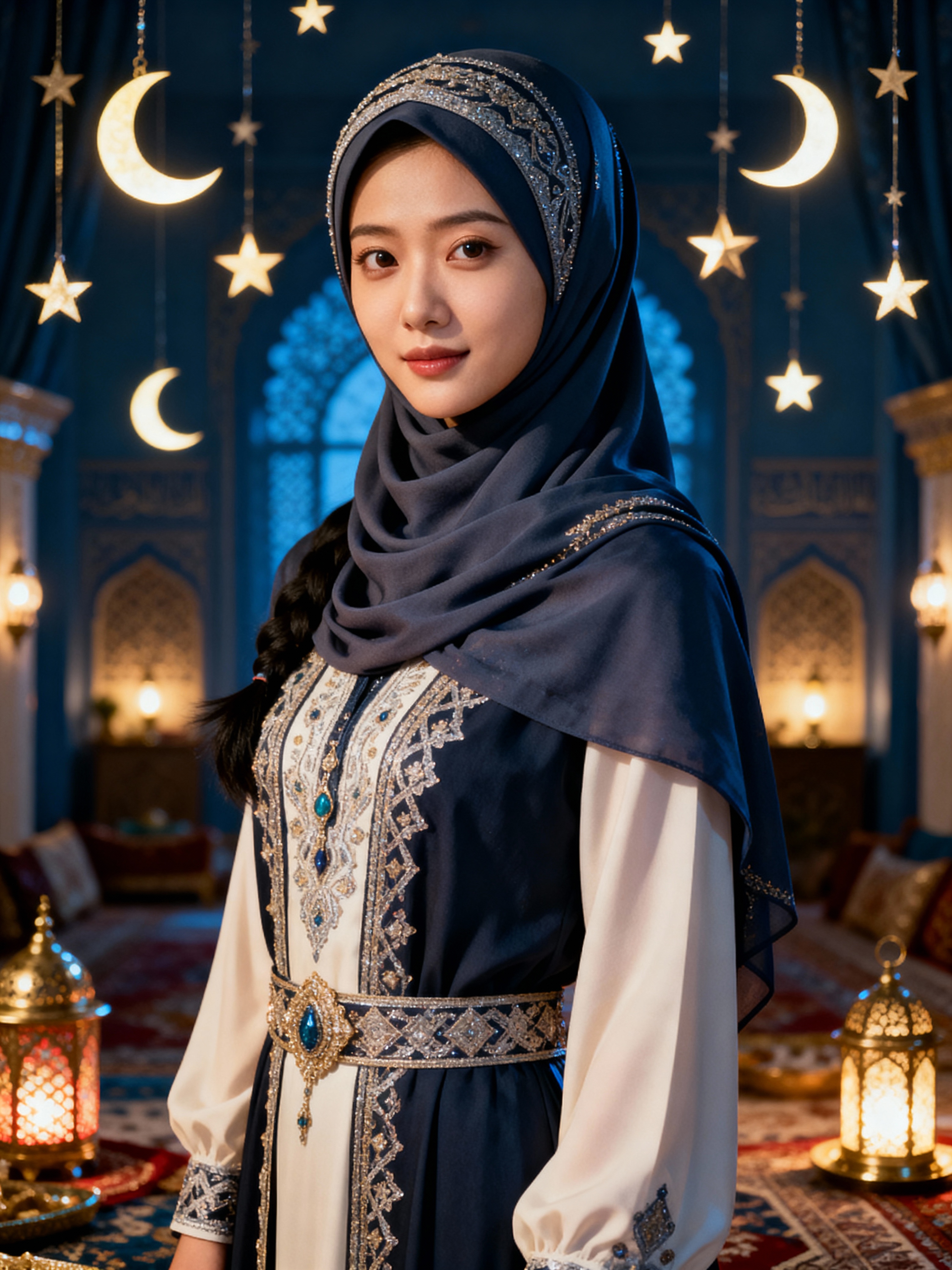 a stunning model with an elegantly styled hijab and modest festive attire , capturing the essence of Eid traditions in a room decorated with crescent moons and stars