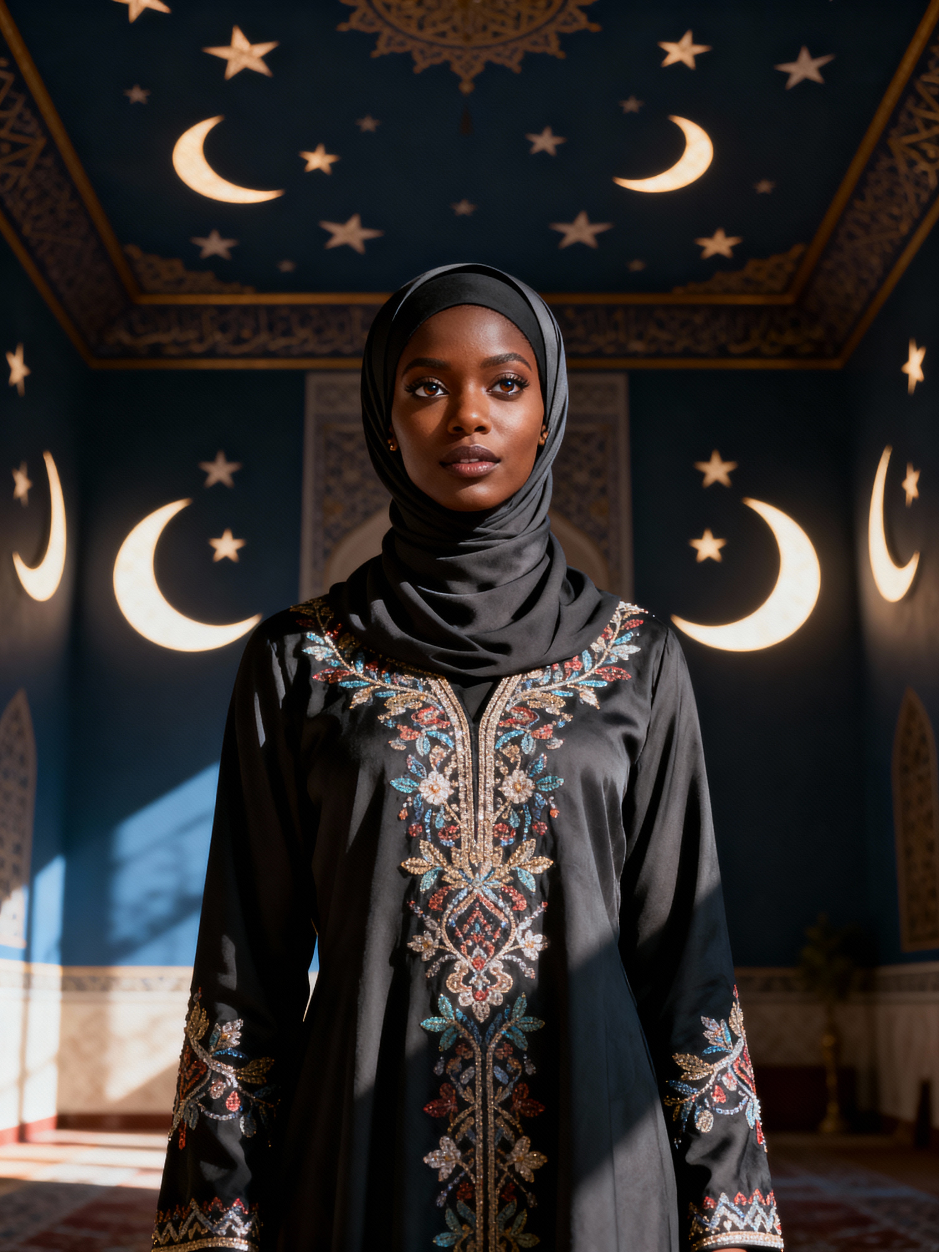 a stunning model with an elegantly styled hijab and modest festive attire , capturing the essence of Eid traditions in a room decorated with crescent moons and stars