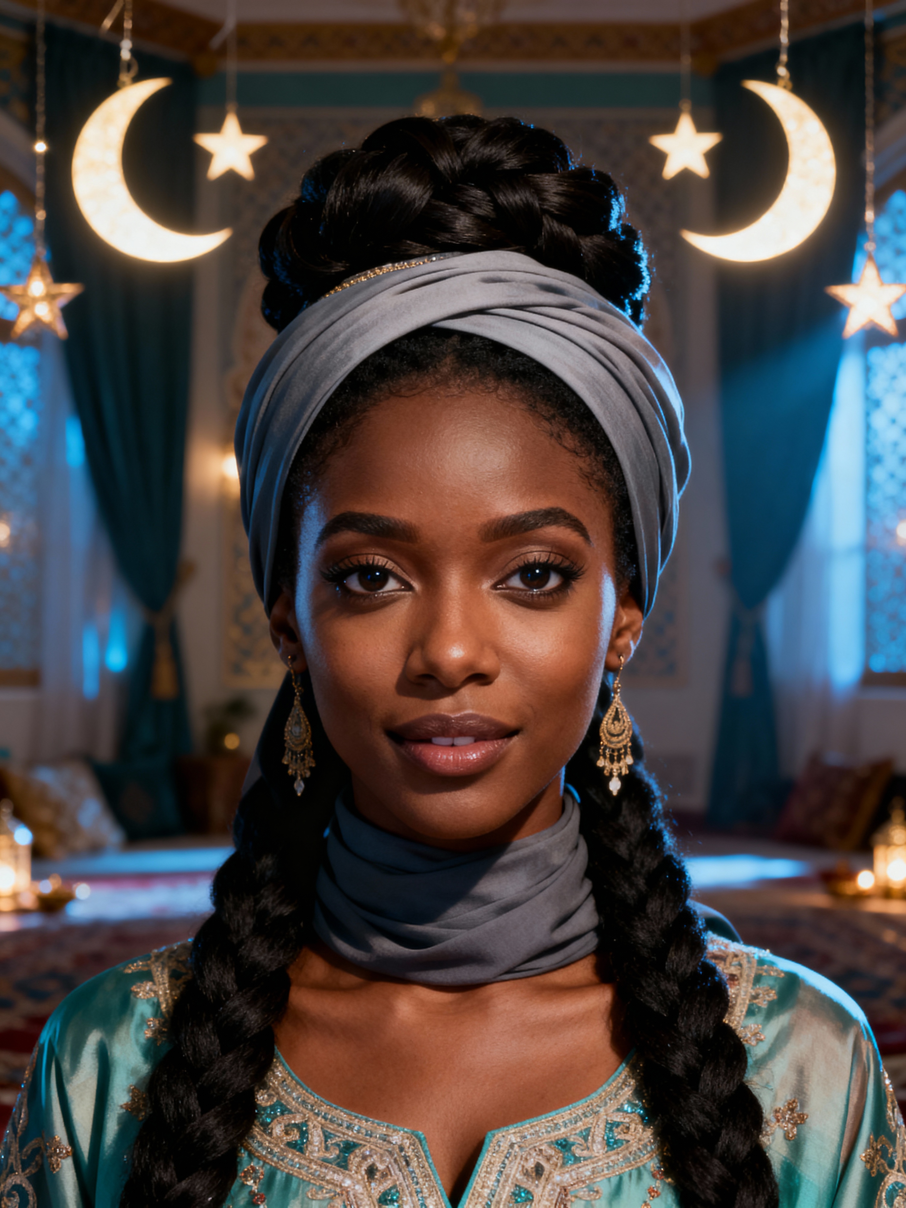 a stunning model with an elegantly styled hijab and modest festive attire , capturing the essence of Eid traditions in a room decorated with crescent moons and stars
