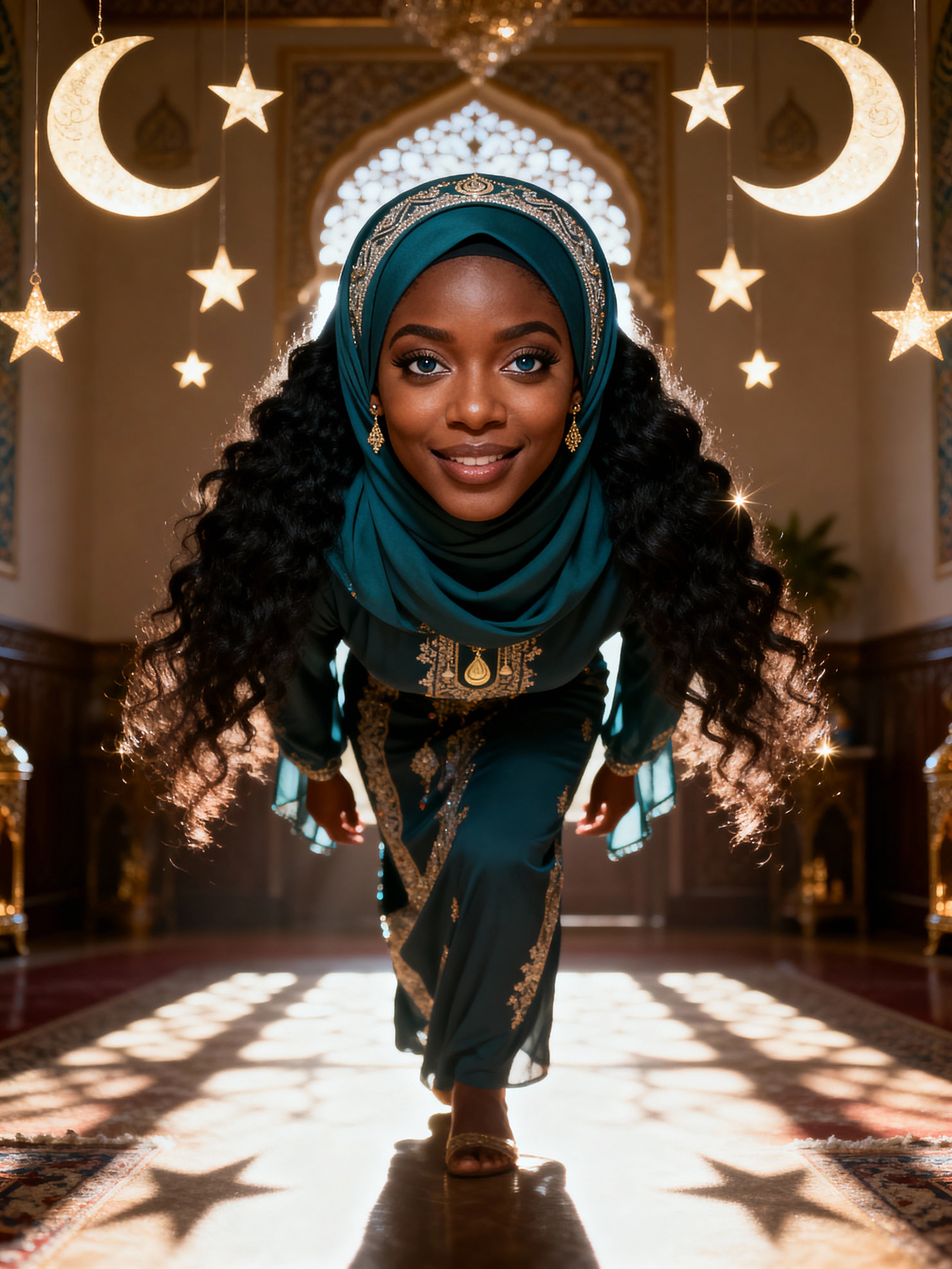 a stunning model with an elegantly styled hijab and modest festive attire , capturing the essence of Eid traditions in a room decorated with crescent moons and stars