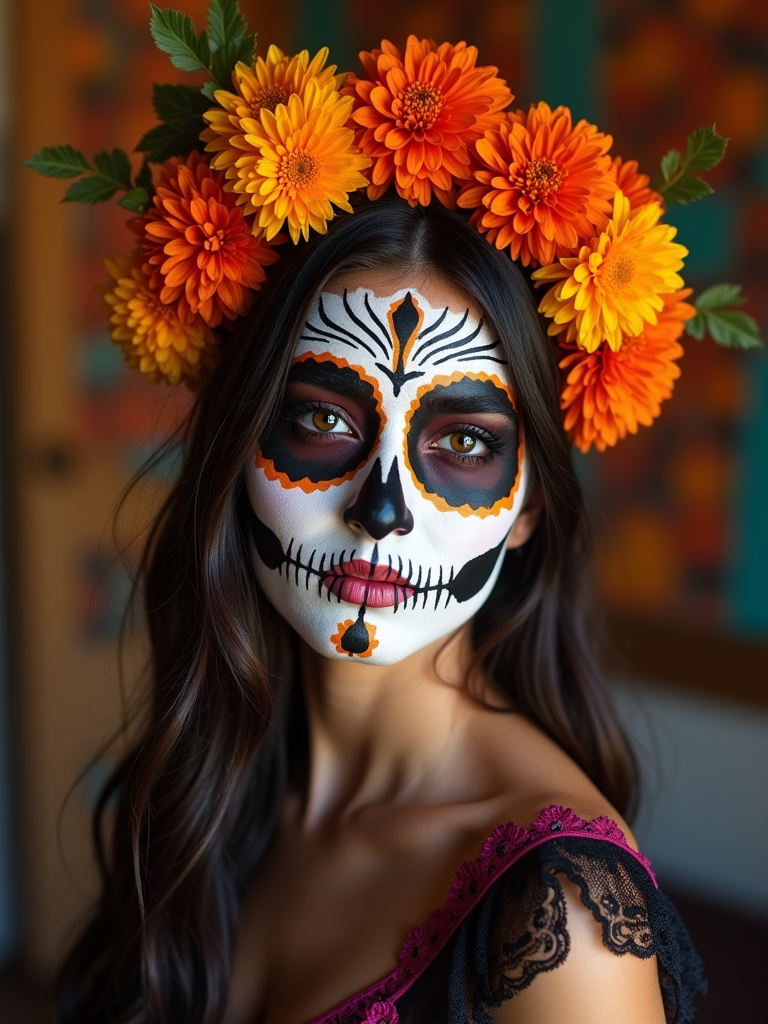 a stunning model with face painted in traditional calavera makeup with intricate designs , capturing the essence of Día de los Muertos in a room decorated with papel picado and marigold flowers