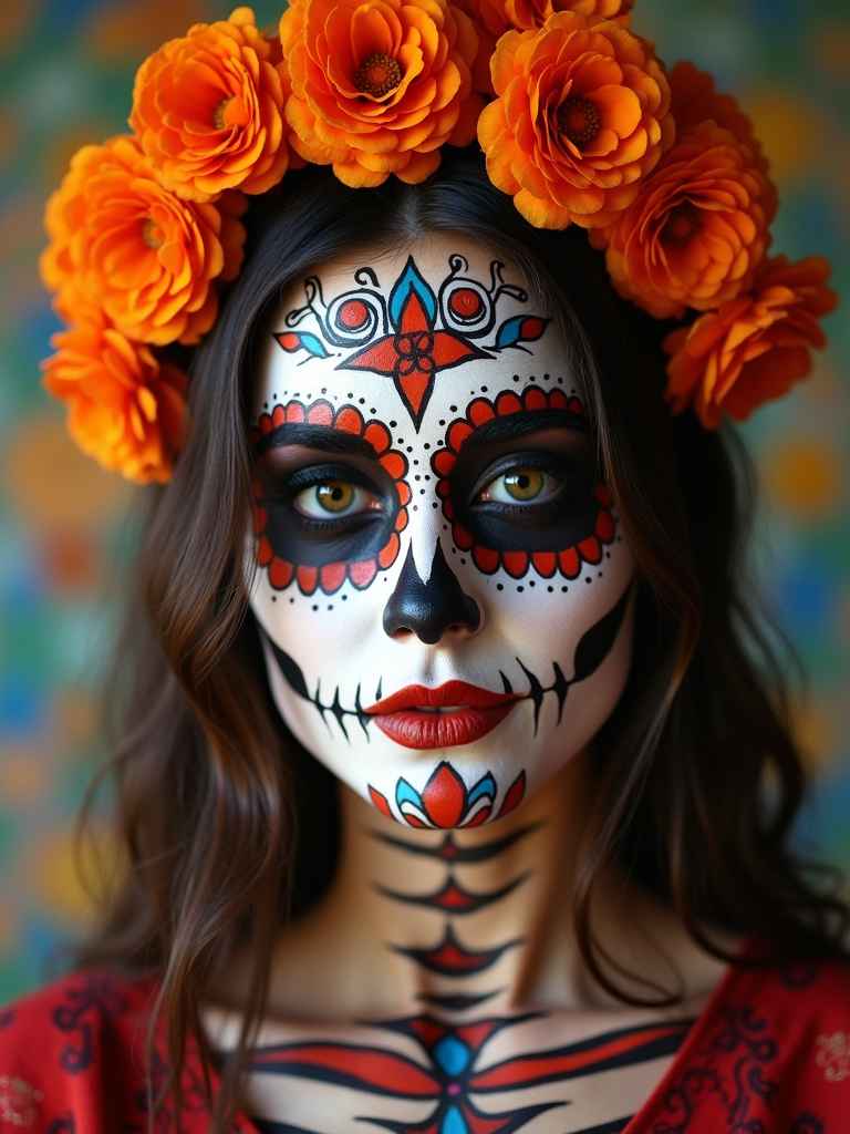 a stunning model with face painted in traditional calavera makeup with intricate designs , capturing the essence of Día de los Muertos in a room decorated with papel picado and marigold flowers