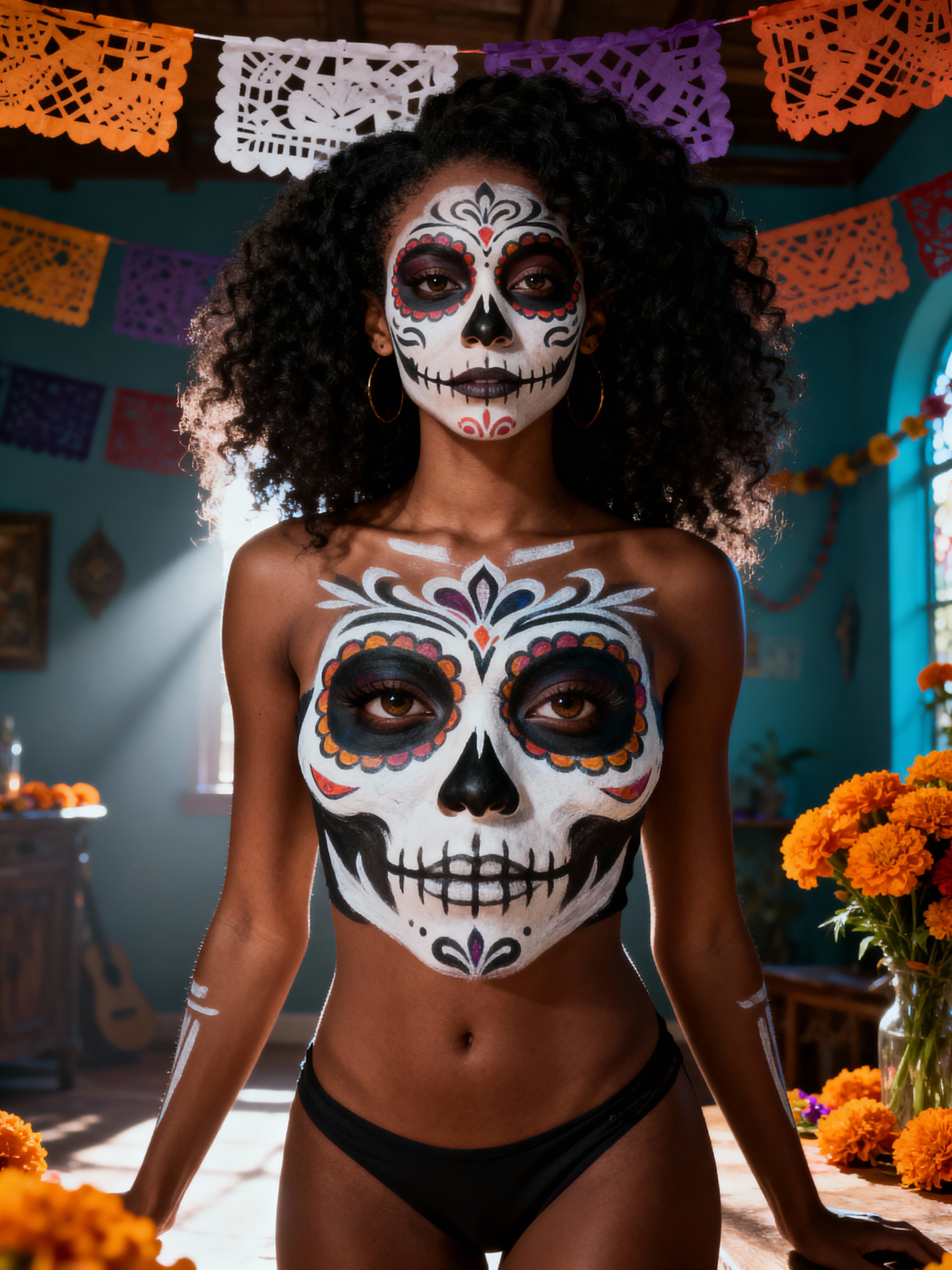 a stunning model with face painted in traditional calavera makeup with intricate designs , capturing the essence of Día de los Muertos in a room decorated with papel picado and marigold flowers