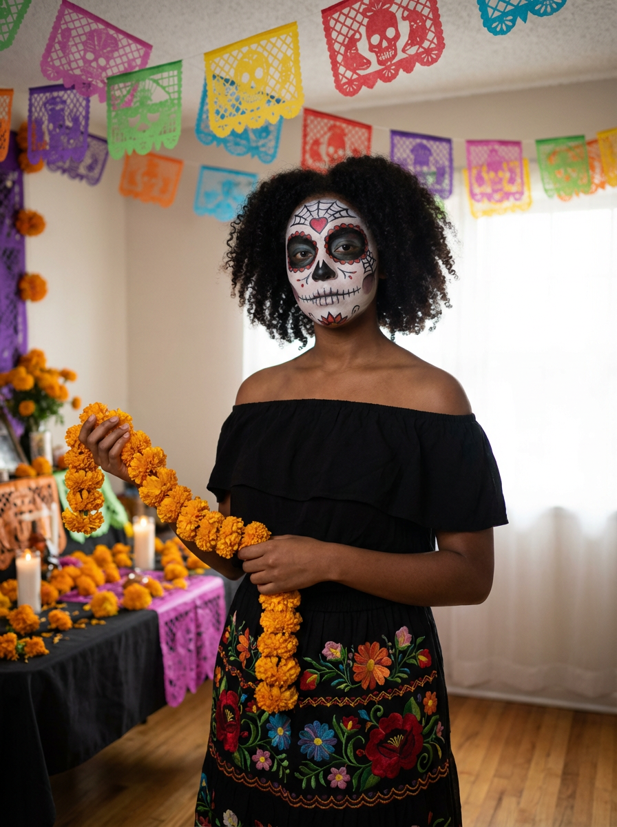 a stunning model with face painted in traditional calavera makeup with intricate designs , capturing the essence of Día de los Muertos in a room decorated with papel picado and marigold flowers