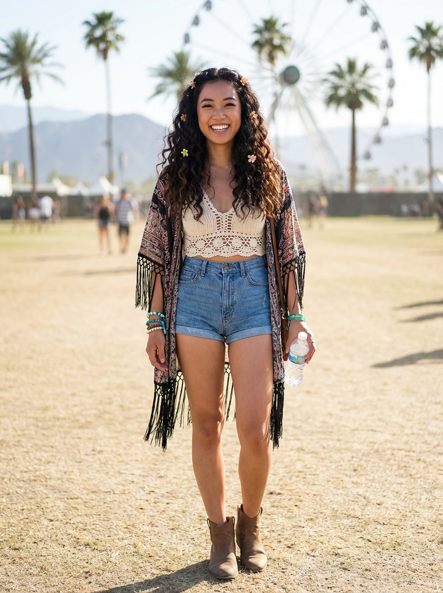 a stunning model with flowing curly hair and flower accessories , capturing the essence of Coachella fashion in the California desert