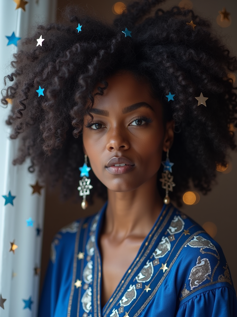 a stunning model with hair adorned with subtle blue and silver accessories , capturing the essence of Hanukkah traditions in a room decorated with Stars of David and blue and silver ornaments