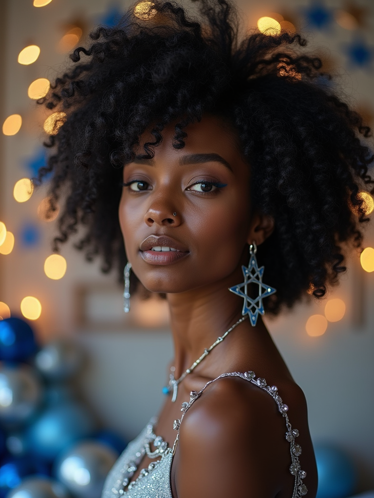 a stunning model with hair adorned with subtle blue and silver accessories , capturing the essence of Hanukkah traditions in a room decorated with Stars of David and blue and silver ornaments