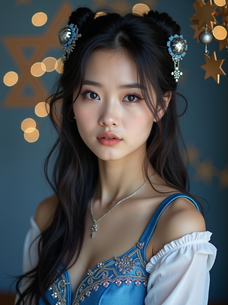 a stunning model with hair adorned with subtle blue and silver accessories , capturing the essence of Hanukkah traditions in a room decorated with Stars of David and blue and silver ornaments
