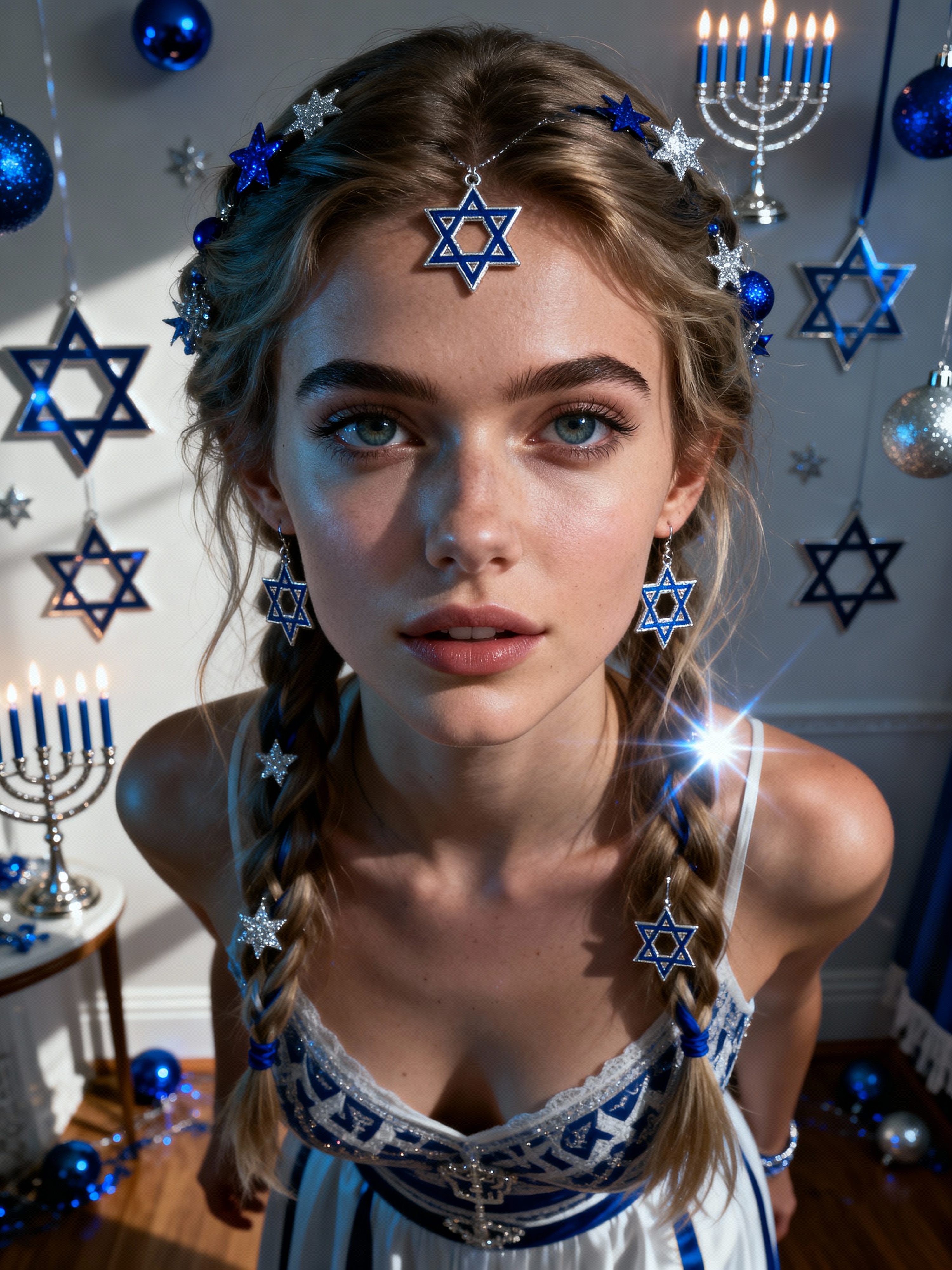 a stunning model with hair adorned with subtle blue and silver accessories , capturing the essence of Hanukkah traditions in a room decorated with Stars of David and blue and silver ornaments