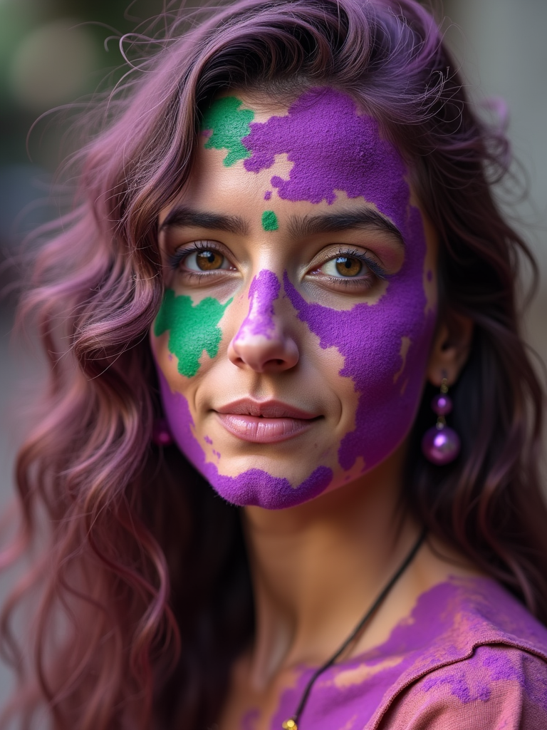 a stunning model with hair and face decorated with purple and green Holi colors , capturing the essence of this ancient Hindu celebration