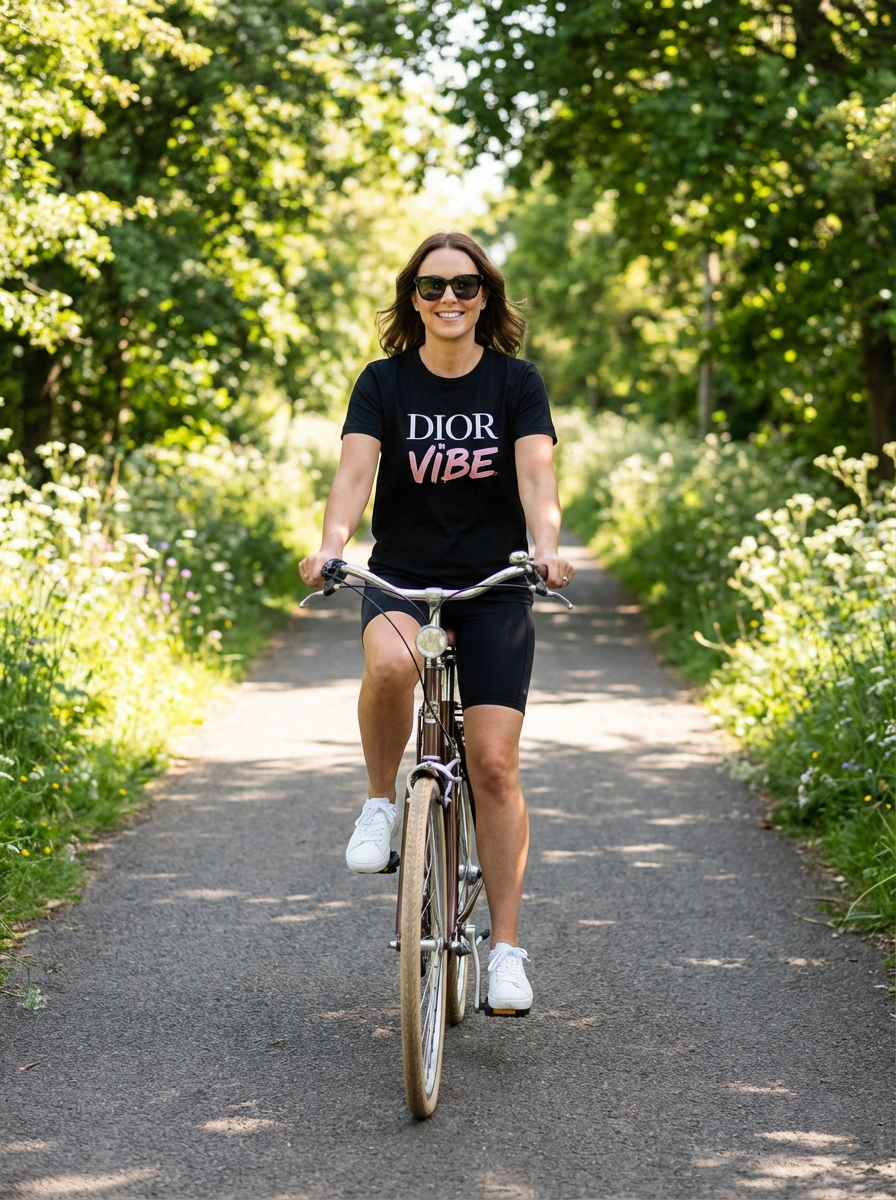 a stylish feminine model enjoying a leisurely bike ride along a scenic path