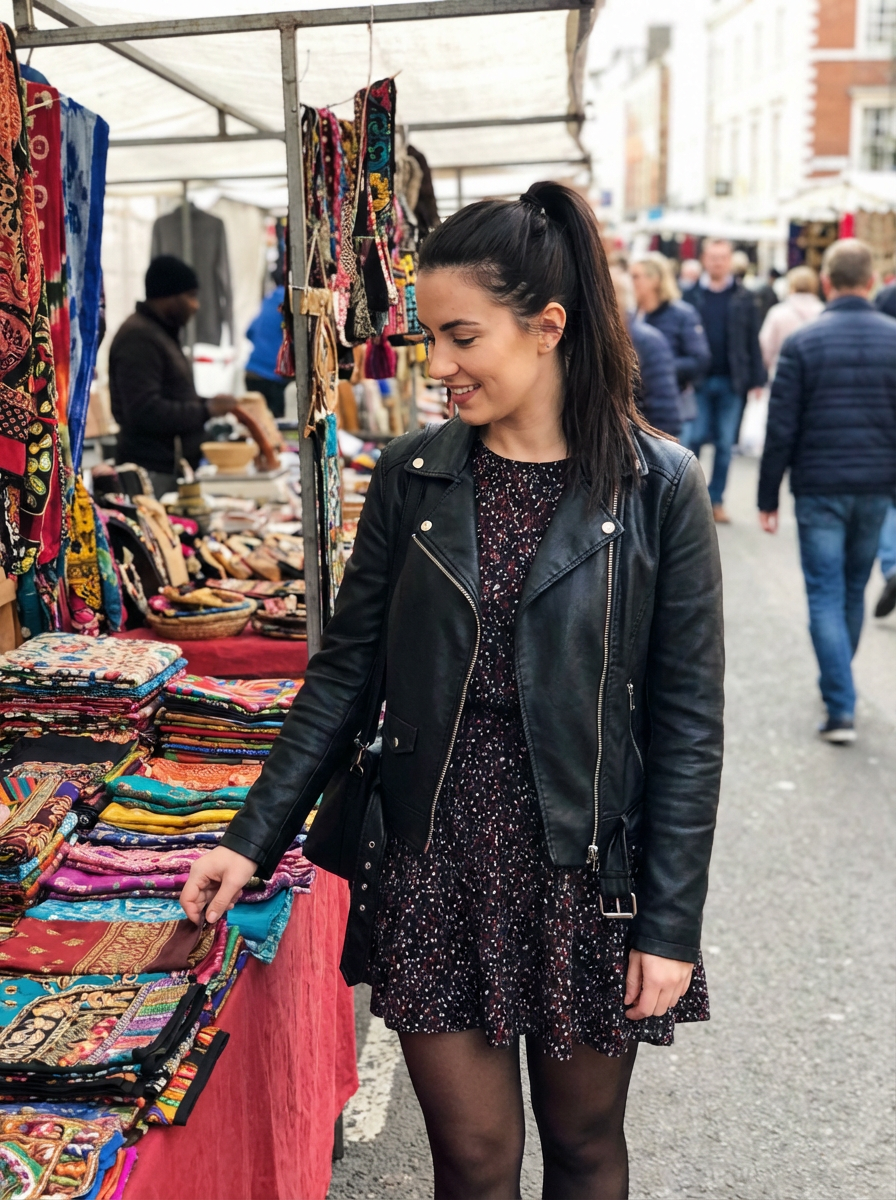 a stylish feminine model exploring a street market
