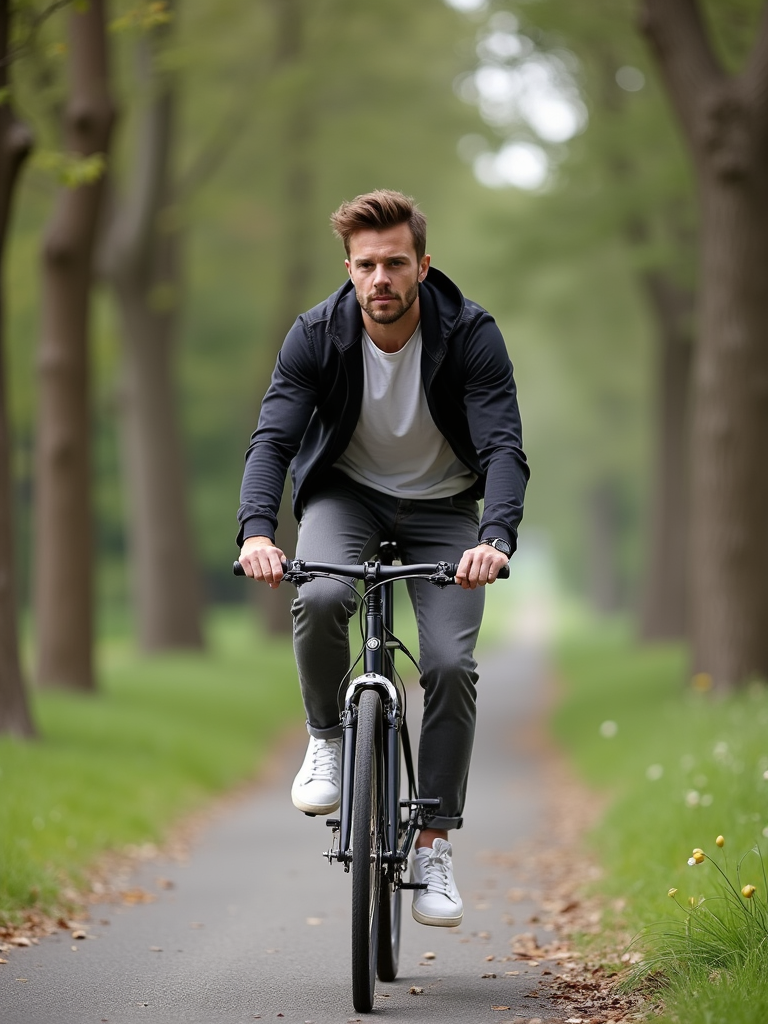 a stylish masculine model enjoying a leisurely bike ride along a scenic path
