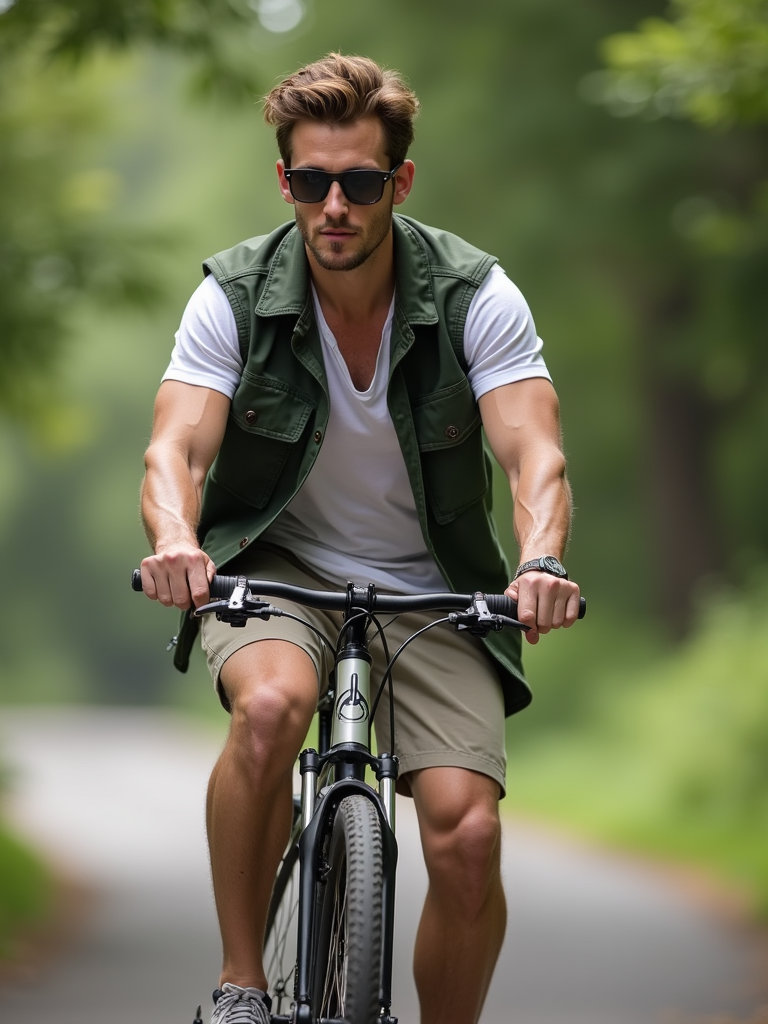 a stylish masculine model enjoying a leisurely bike ride along a scenic path