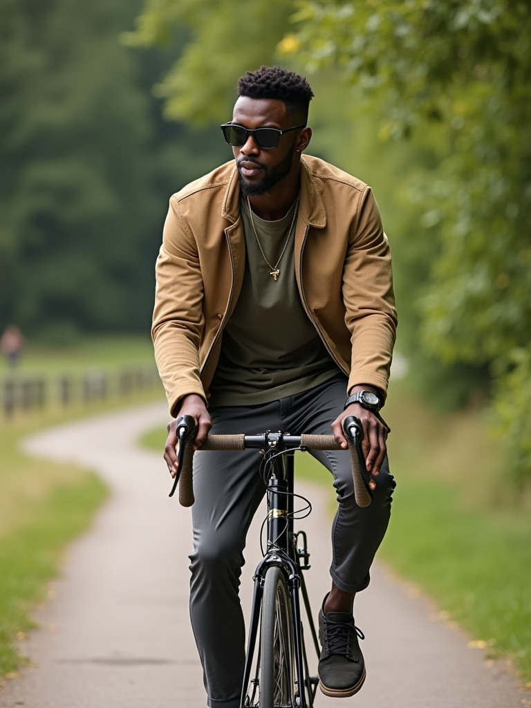 a stylish masculine model enjoying a leisurely bike ride along a scenic path