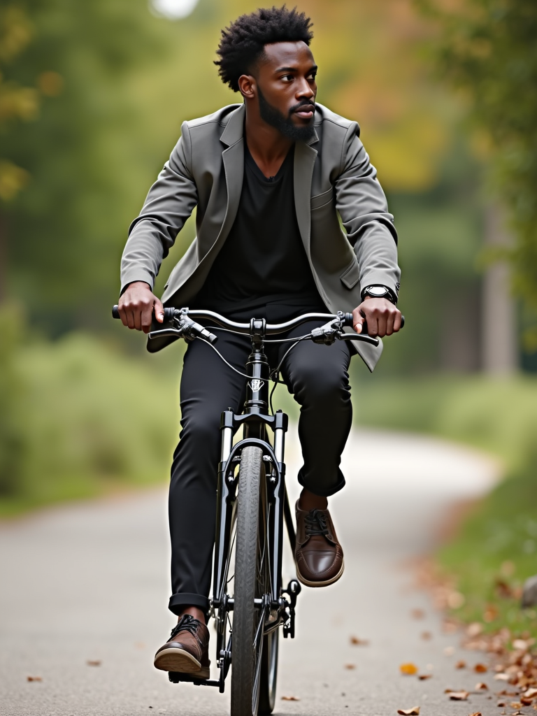 a stylish masculine model enjoying a leisurely bike ride along a scenic path