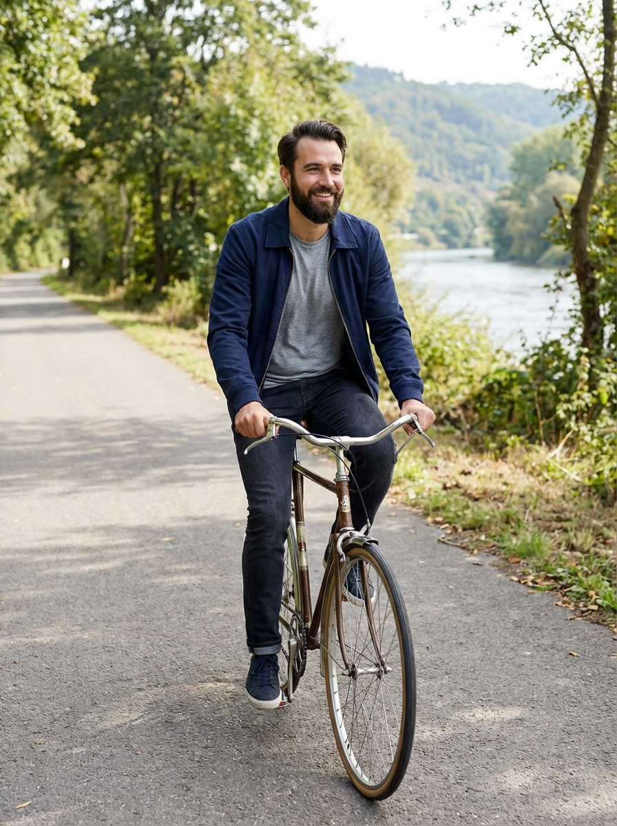 a stylish masculine model enjoying a leisurely bike ride along a scenic path