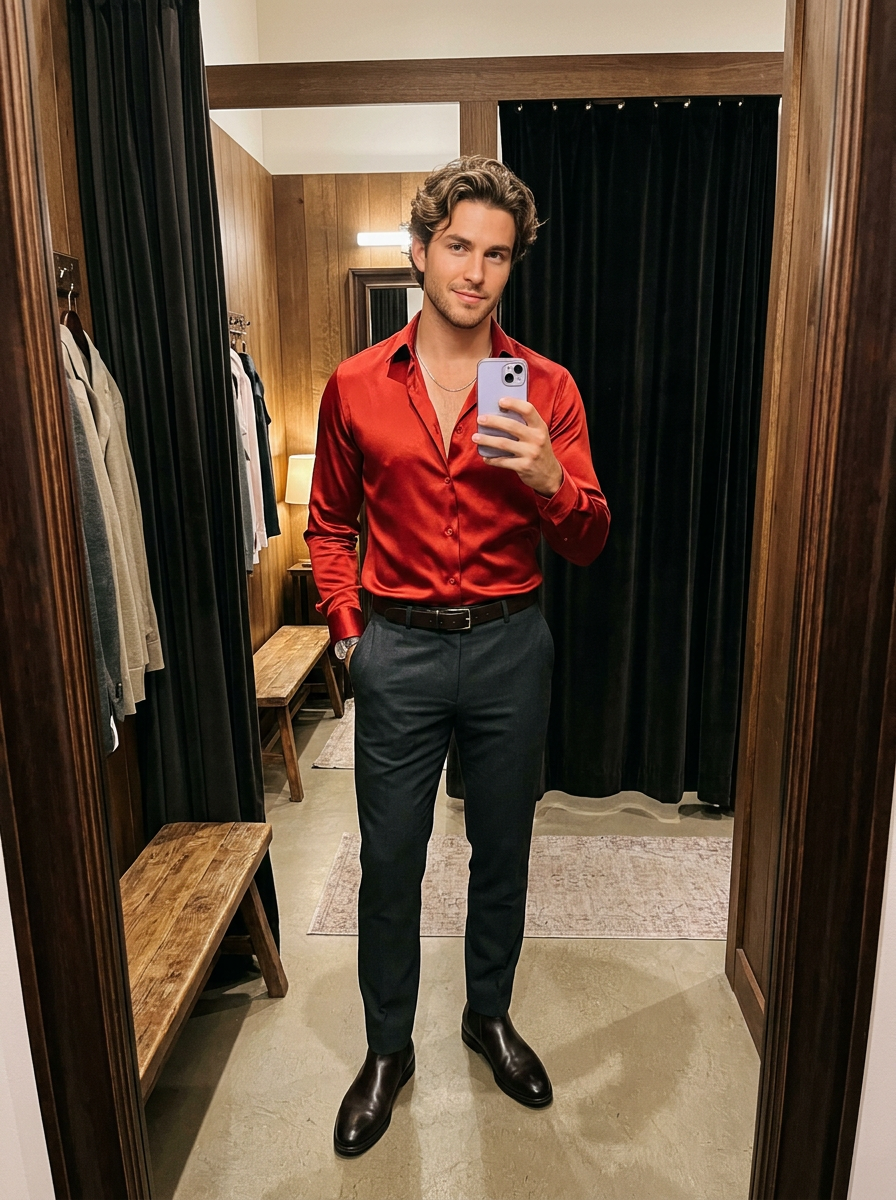A stylish, realistic full-length portrait of a handsome young male model in a fitting, vibrant red satin dress shirt. The shirt features a flattering open collar. He is posing inside a dressing room, capturing a mirror reflection that shows his full outfit and profile. He has wavy, neatly styled medium-length brown hair with highlights, groomed skin with light stubble and natural features, and is looking directly at his phone, which is held up to take a selfie. The phone case is light purple. The environment is a boutique dressing room with dark, vertical curtains in the background and soft, warm interior lighting creating a dramatic, reflective effect on the satin fabric. The atmosphere is confident and chic.