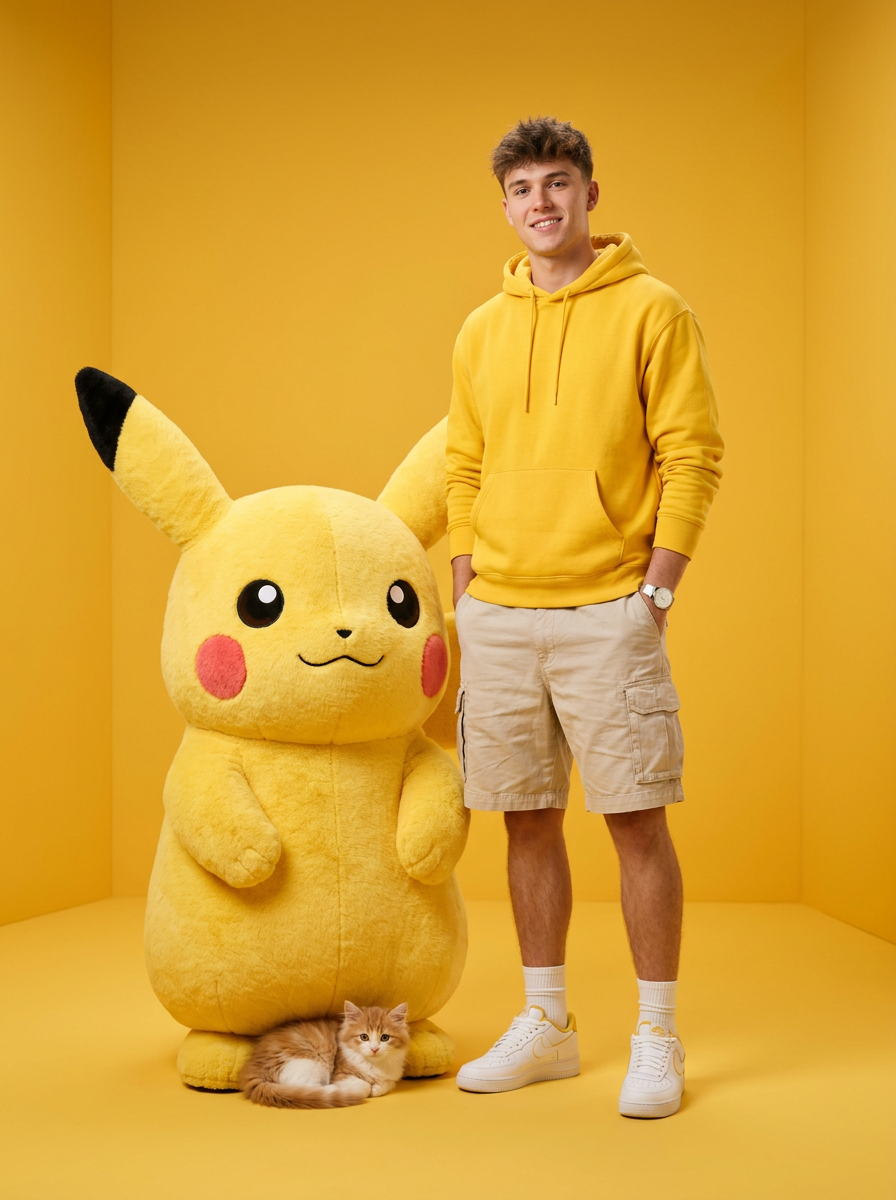 A stylish young model (1000% same person) standing confidently beside a giant, fluffy Pikachu in a bright monochromatic yellow studio setup. He wears a yellow hoodie, beige cargo shorts, white sneakers, and minimal accessories, creating a clean, coordinated aesthetic. A small orange kitten sits adorably at Pikachuโs feet, adding cuteness to the scene. Smooth soft lighting, high-end studio photography, 85mm lens, shallow depth of field, look. ultra-realistic textures, vibrant colors, clean background, professionally composed hero-shot poster style. Crisp details, warm atmosphere, polished commercial.