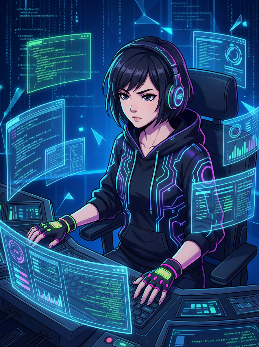 A tech-savvy anime hacker in a dark, futuristic room, surrounded by floating holographic screens. The model wears a high-tech hoodie with glowing circuit patterns and neon accessories . The background is a deep digital blue with cascading lines of code. The style is in anime illustration.