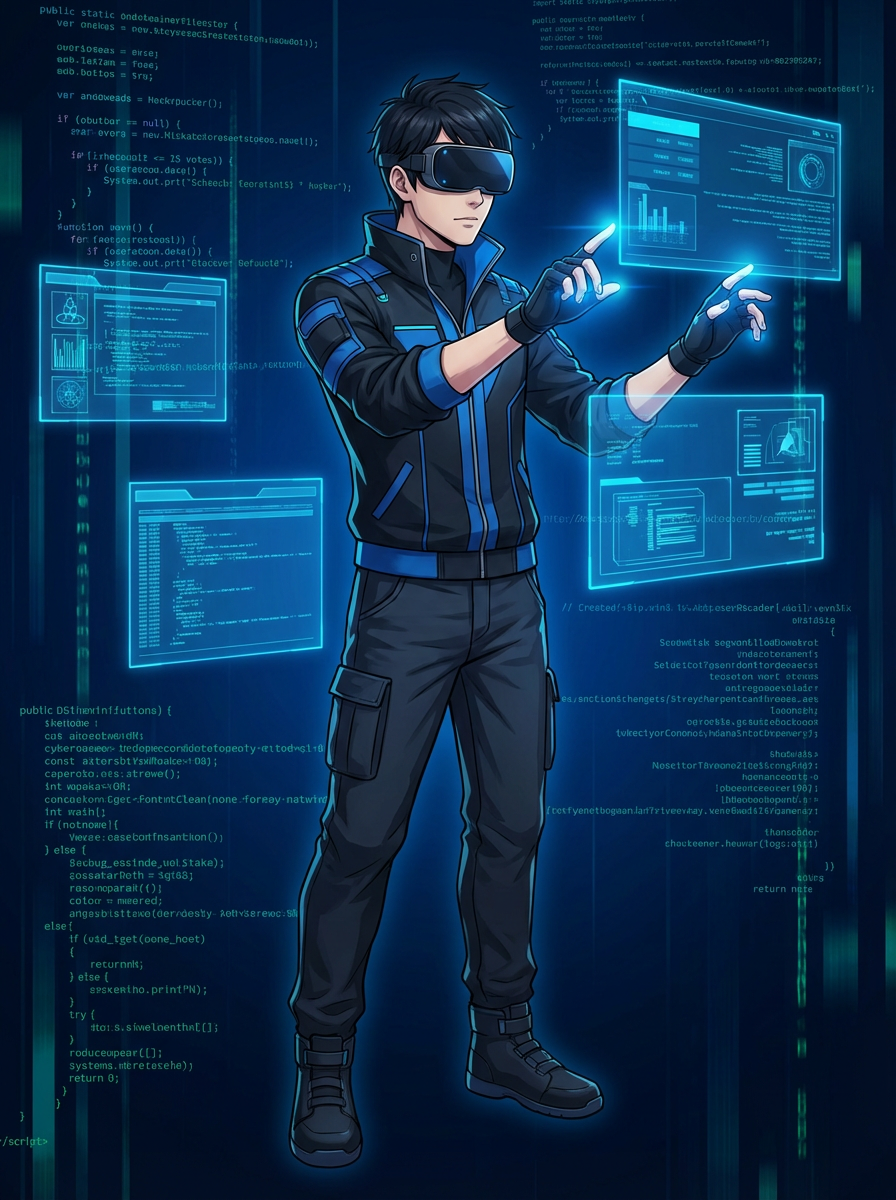 A tech-savvy anime hacker in a dark, futuristic room, surrounded by floating holographic screens. The model wears a cyber jacket with a sleek VR visor and glowing fingertips. The background is a deep digital blue with cascading lines of code. The style is in anime illustration.