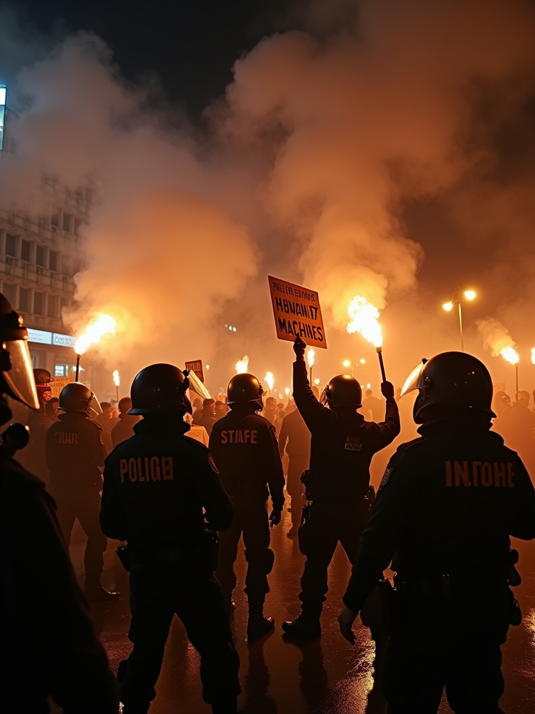 a tense protest scene at night, with riot police pushing back a crowd of angry demonstrators holding torches and signs saying 'stop ai manipulation' and 'human art over machines.' tear gas fills the air as TV news channel-style reporters duck for cover. the chyron at the bottom reads: 'clashes at ai video protest—multiple arrests reported.' the camera shakes as protesters chant, 'ban ai lies!' while police use shields to block them.