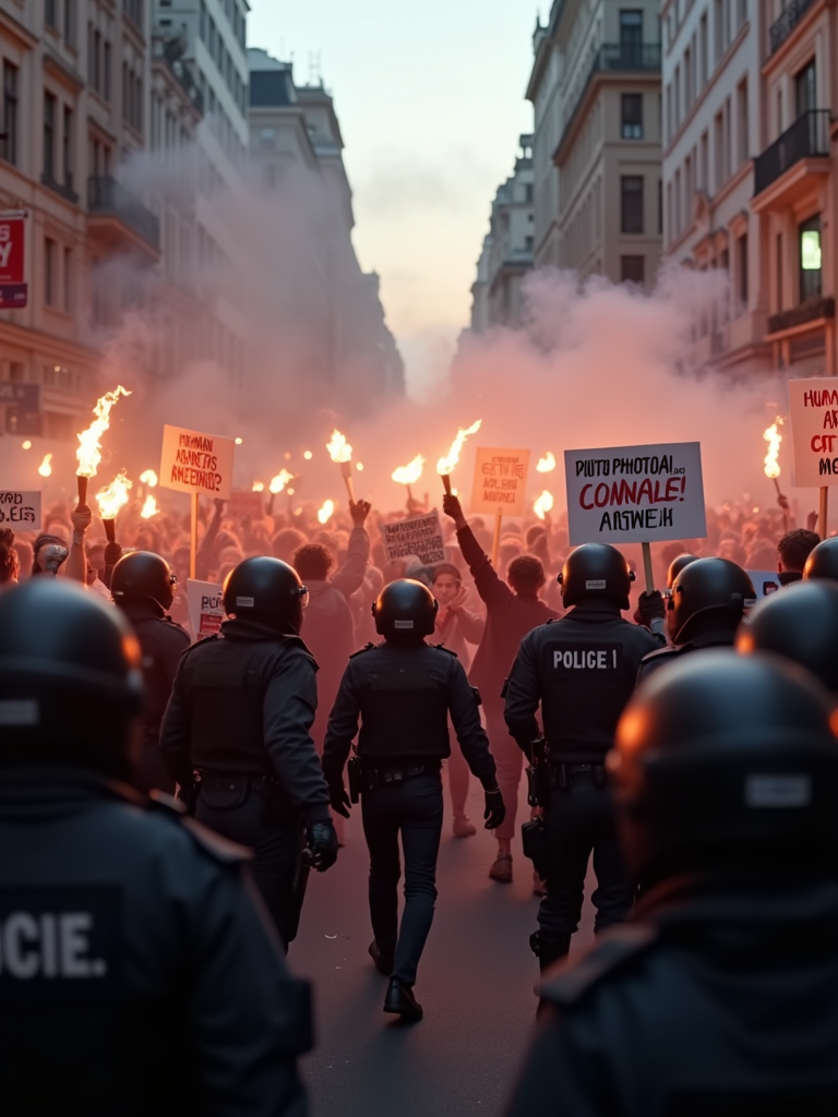 a tense protest scene in the day, with riot police pushing back a crowd of angry demonstrators holding torches and signs saying 'stop PhotoAI.com' and 'human art over machines.' tear gas fills the air as TV news channel-style reporters duck for cover. the chyron at the bottom reads: 'clashes at ai video protest—multiple arrests reported.' the camera shakes as protesters chant, 'ban ai lies!' while police use shields to block them.