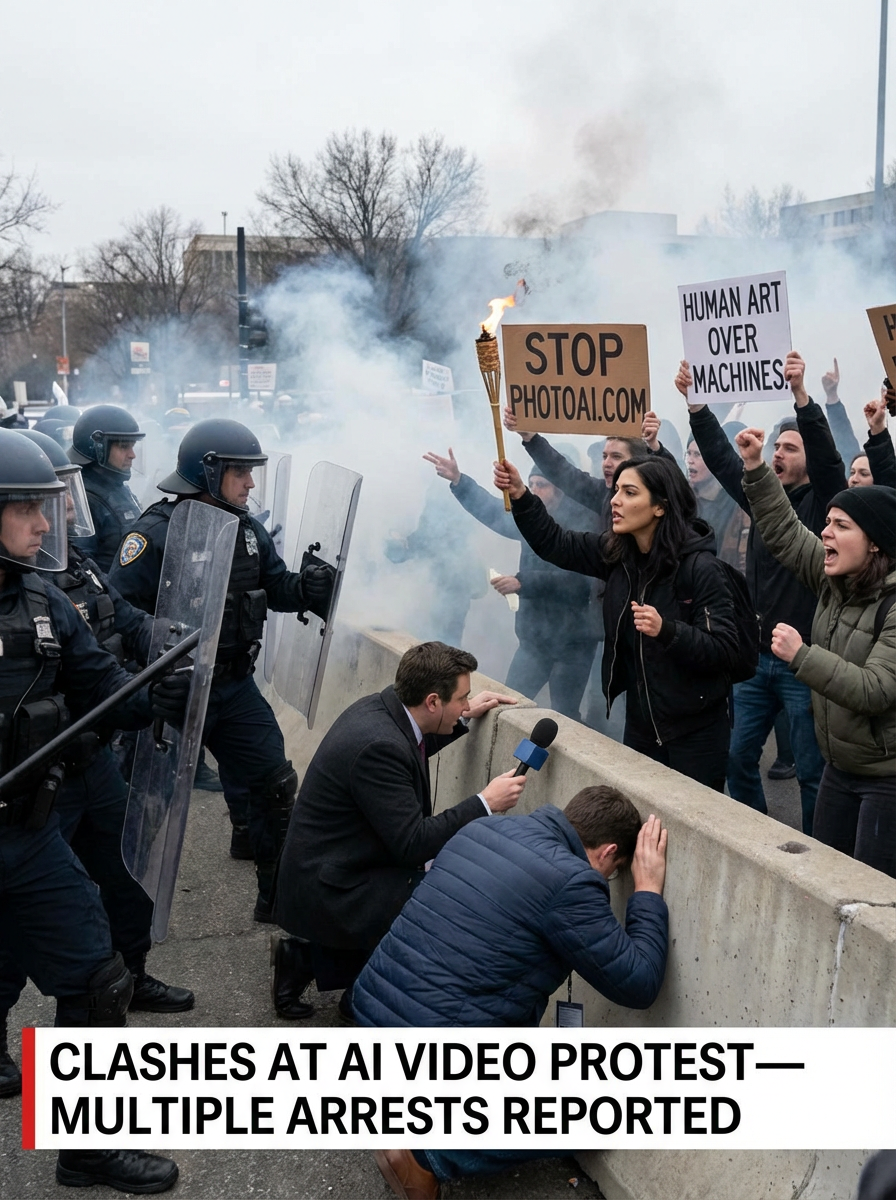 a tense protest scene in the day, with riot police pushing back a crowd of angry demonstrators holding torches and signs saying 'stop PhotoAI.com' and 'human art over machines.' tear gas fills the air as TV news channel-style reporters duck for cover. the chyron at the bottom reads: 'clashes at ai video protest—multiple arrests reported.' the camera shakes as protesters chant, 'ban ai lies!' while police use shields to block them.