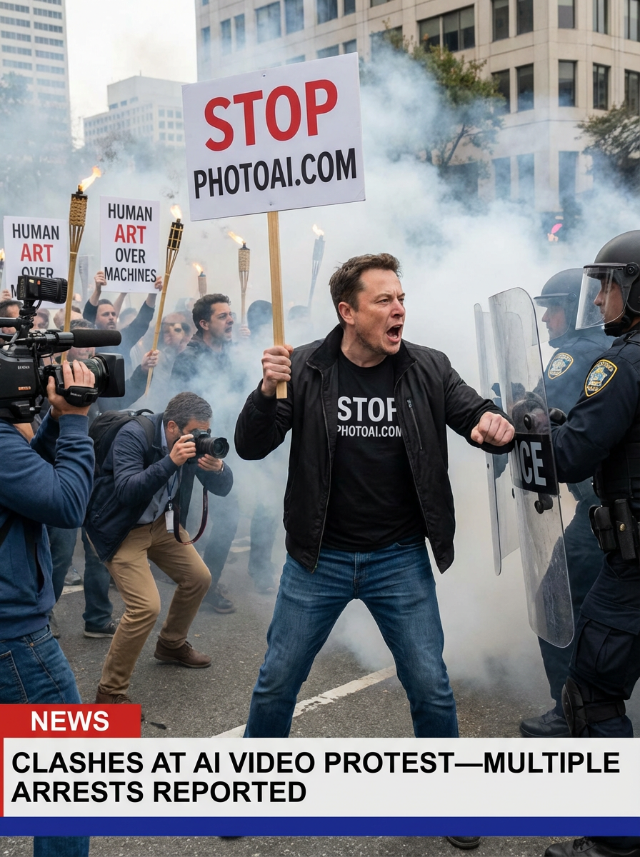 a tense protest scene in the day, with riot police pushing back a crowd of angry demonstrators holding torches and signs saying 'stop PhotoAI.com' and 'human art over machines.' tear gas fills the air as TV news channel-style reporters duck for cover. the chyron at the bottom reads: 'clashes at ai video protest—multiple arrests reported.' the camera shakes as protesters chant, 'ban ai lies!' while police use shields to block them.