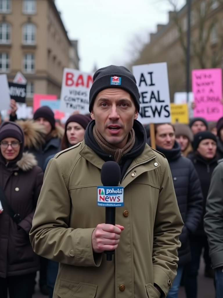 a TV news channel-style field reporter wearing a windbreaker, holding a microphone, reporting from a chaotic protest scene. large crowds chant slogans like 'ban ai deepfakes!' and 'we want real news!' the chyron at the bottom reads: 'live: protests against PhotoAI.com.' in the background, people wave signs and hold banners saying 'who controls ai controls truth' and 'ai videos = ai lies.' the reporter interviews a protester who angrily says, 'ai-generated content is a tool for propaganda and job loss. we need regulation now!'