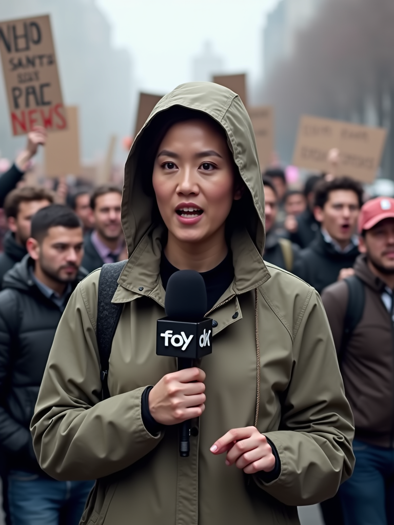 a TV news channel-style field reporter wearing a windbreaker, holding a microphone, reporting from a chaotic protest scene. large crowds chant slogans like 'ban ai deepfakes!' and 'we want real news!' the chyron at the bottom reads: 'live: protests against PhotoAI.com.' in the background, people wave signs and hold banners saying 'who controls ai controls truth' and 'ai videos = ai lies.' the reporter interviews a protester who angrily says, 'ai-generated content is a tool for propaganda and job loss. we need regulation now!'